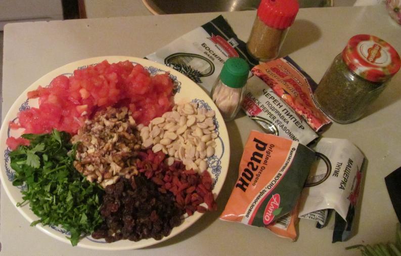 Към плънката още добавих връзка магданоз, 100 г разполовени едри стафиди, 100 г намачкани на едро орехи, 100 г обелени разполовени сурови фъстъци (но май бяха малко в повечко) и 70 г годжи бери. Всичко това смесих в купа и подправих с хималайска сол, черен пипер, риган, мащерка, босилек, чубрица и малко шарена сол. Няма нужда от допълнителна мазнина, защото шаранът ще пусне свой собствен сос, който внася перфектен завършек на пълнежа.