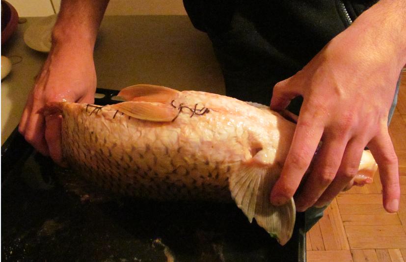След това извадих главния герой от хладилника, измих го от новата кръв и слуз, която бе пуснал и го осолих отново, като добавих и универсална подправка за риба. Не се учудвайте ако рибата отново започне да се тикосва при осоляване. С ръка плънката се набутва хубаво в корема, а после настава веселбата със зашиването. Трябва ви дебел двоен конец и дебела остра игла. Втори чифт ръце е препоръчителен, защото шаранът се пързаля силно и не може да бъде удържан от самия „шивач“. Шийте от главата към опашката, като при перките се пригответе за затруднения, тъй като подкожно костните образувания продължават да пречат. В този момент използвайте напръстник или поне метален предмет, за да упражните нужната сила на натиск без да се убодете. Завършете с традиционен шивашки възел, за да не рискувате плънката да изтече по време на готвене.