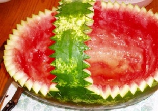 1. С голям нож изрежете горната 1/3 част на динята на триъгълничета. (Останалото ще служи за кошница за сервиране.)