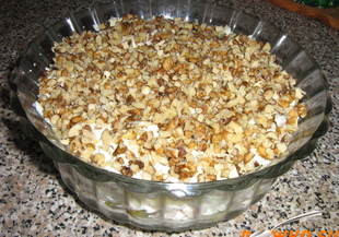 8. Осмият пласт е последен. Идва ред на орехите. Счукайте ги в хаванче или ги смелете в чопър и поръсете с тях осемпластовия ордьовър.