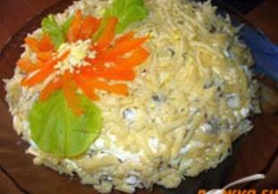 Яйчена салата с месо, краставици, гъби и майонеза.