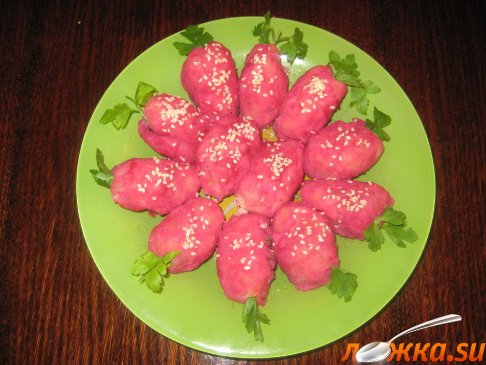 Картофени хапки в червено с рибен аромат.