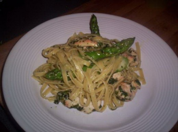 Фетучини с песто, аспержи и пилешко